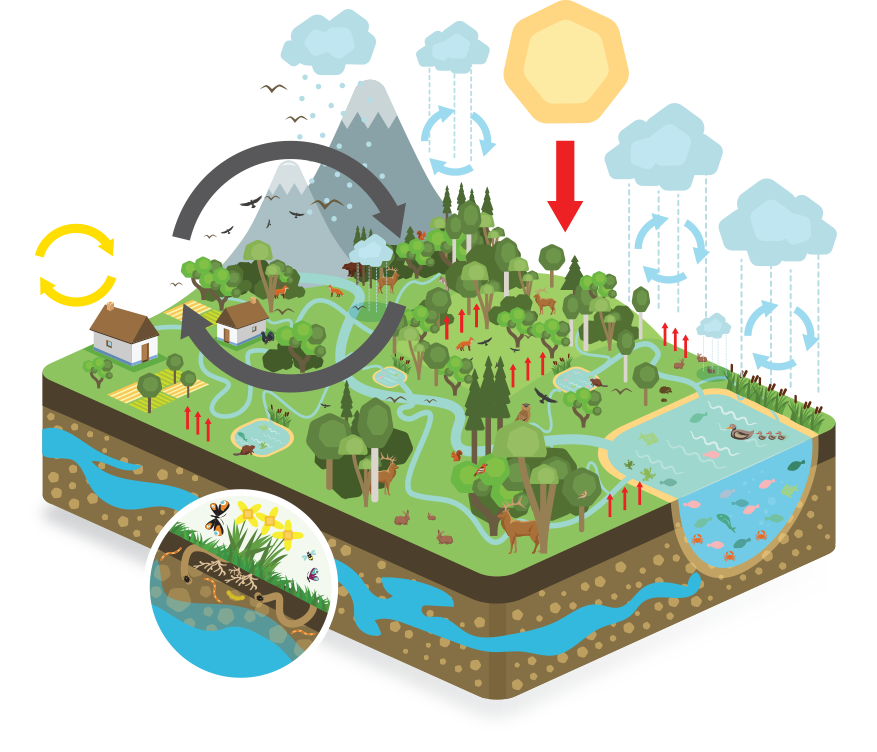 In healthy, water-saturated areas, water circulates many times in small amounts and for short distances. The majority of water that evaporates condenses again in the given region. This causes the majority of the solar energy to be consumed in evaporation, as vegetation protects the ground from overheating.