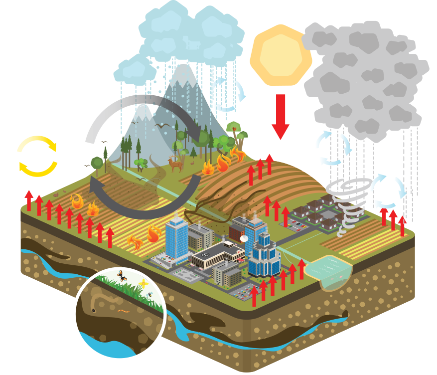 Industrialized agriculture, poorly managed forests, and large urban areas impact climate negatively while bringing ecosystems to the brink of extinction.